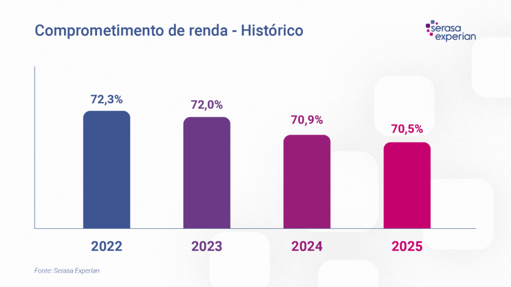 Já em termos históricos, é possível observar uma leve queda ao longo dos anos. No comparativo entre o primeiro ano da série histórica com o último, houve uma queda de 1,8 p.p., saindo de um comprometimento médio geral de 72,3% em 2022 para 70,5% em 2025. Abaixo, o detalhamento ano a ano.