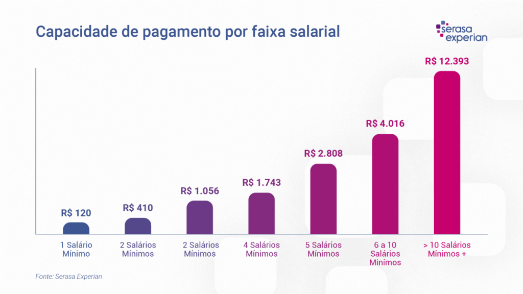 Quanto maior a faixa salarial, maior a capacidade de pagamento, conforme o gráfico abaixo. Olhando para renda de até um salário-mínimo, a capacidade de pagamento é de R$120,00. Para dois salários-mínimos, a capacidade quase quadriplica, atingindo R$410,00. E para três salários-mínimos, o valor chega a R$1.056,00.