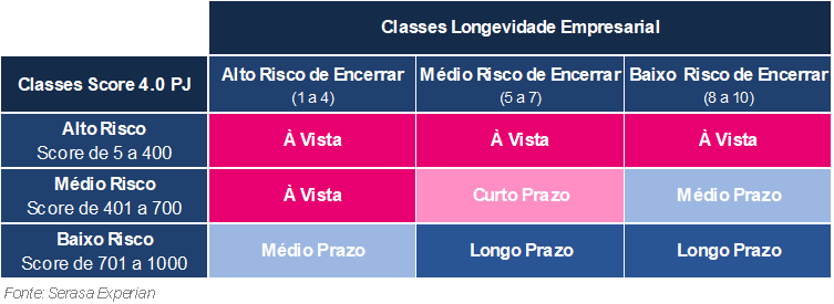 O cruzamento das informações provenientes do índice de Longevidade combinadas com os novos modelos de Score também geram, ainda, recomendações acerca do prazo de pagamento de cada negociação de acordo com o risco de inadimplência ou encerramento das atividades. Para o público com uma alta pontuação de Score, há diferenciação no que é indicado em condições de pagamento. Para empresas que, mesmo com alto Score, possuem uma grande probabilidade de fechamento, pagamento a médio prazo podem ser a melhor opção. Já olhando para as demais empresas, são recomendados pagamentos a longo prazo, por exemplo.