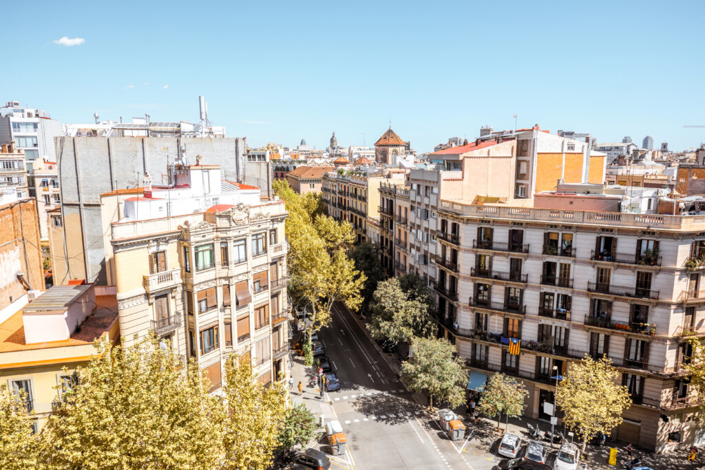 Top view on residential buildings on the street in Barcelona city